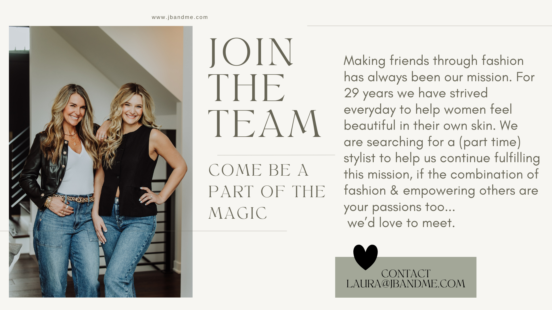 Making its debut in March of 1997 by a mother and daughter team, jb and me strives to offer a blend of designer fashion that appeals to women of all ages.